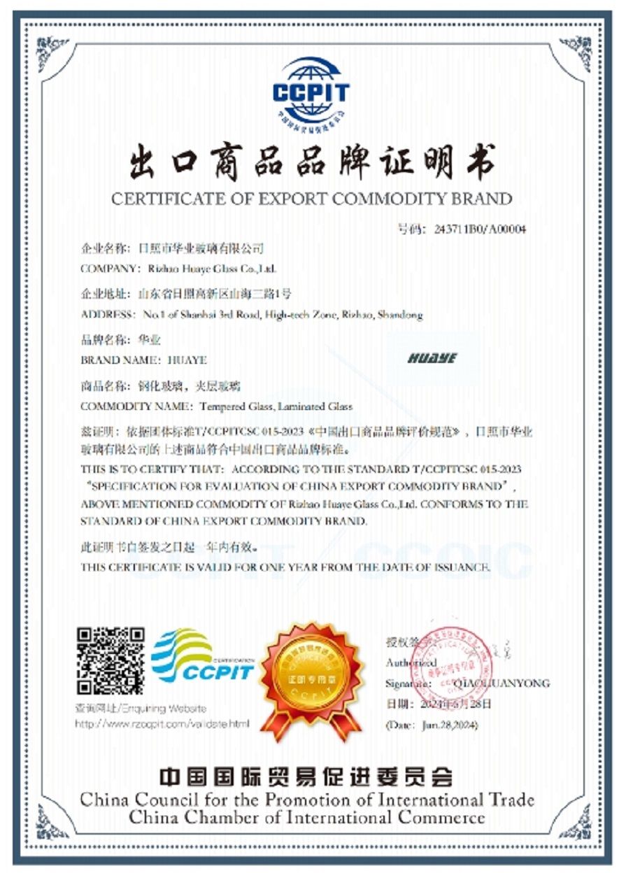 近日,经中国国际贸易促进委员会评审,依据团体标准T/CCPITCSC 015-2023《中国出口商品品牌评价规范》,日照市华业玻璃有限公司的钢化玻璃、夹层玻璃产品符合中国出口商品品牌的标准,荣获“中国出口商品品牌证明书”。